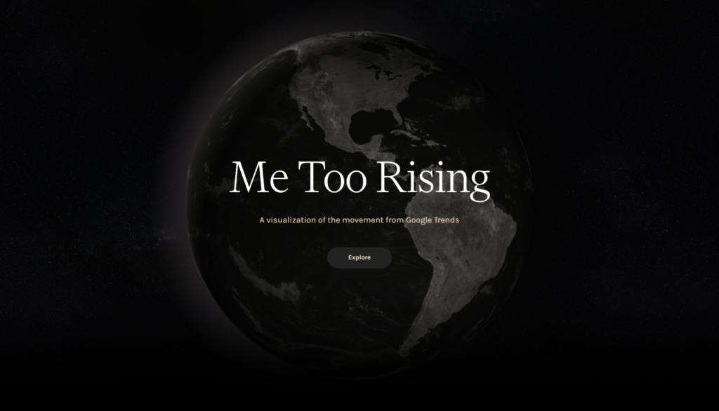ME TOO RISING is an interactive website chronicling the rise and journey of the popular “ME TOO” movement across different countries around the globe. This is an experimental one page website, promoting social activism and awareness. It features past, present and future reports, highlighting campaigns and hashtags that align with top search trends surrounding the movement.